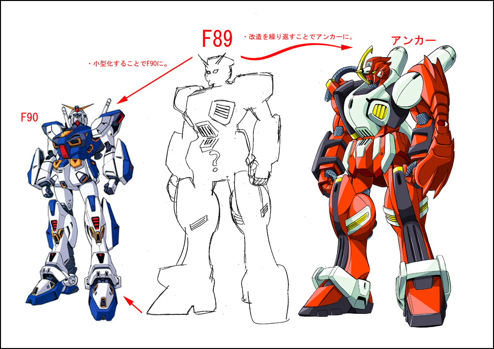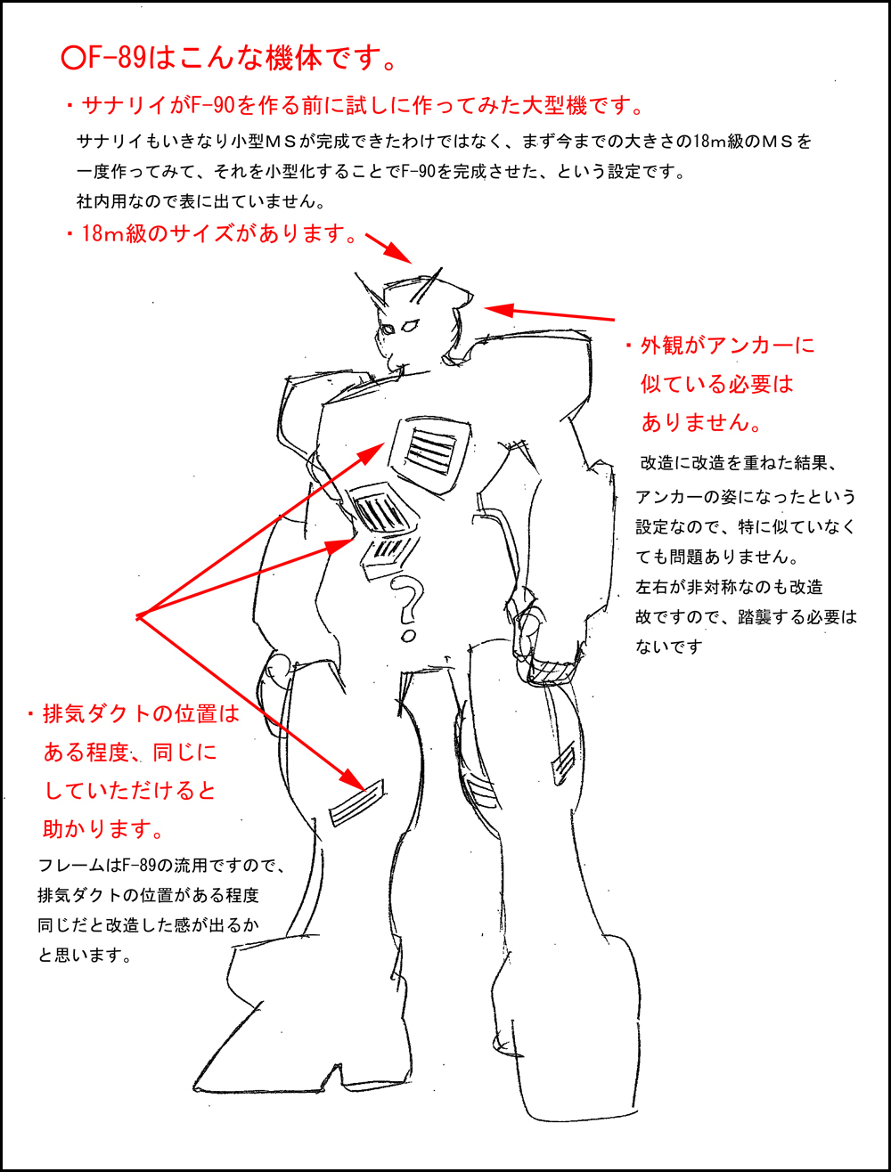 そして、考えに考えぬいた結果、設定が不明瞭だった、アンカーのベース機が「実はF89と呼ばれる、大型機であり、それは小型機F90を開発するためにサナリィがテストでつくった、その前身だった」という設定に思い至るのです!