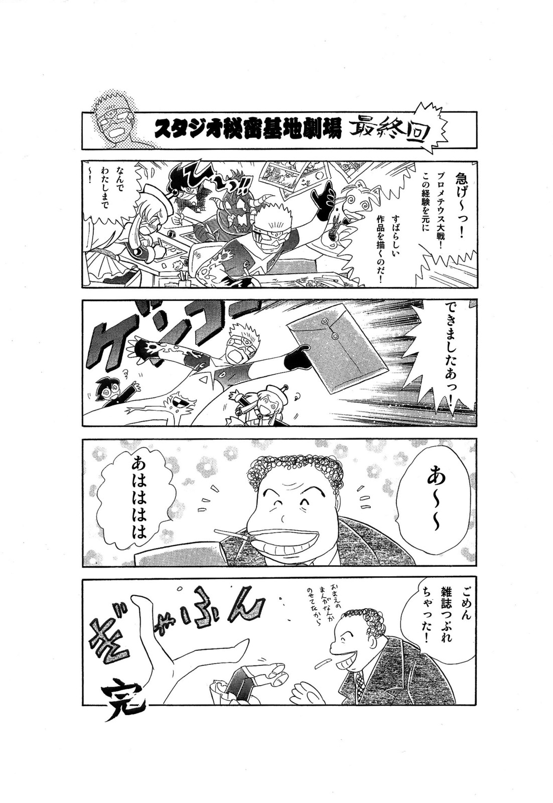 ん〜でも、もったいないような気も。で、色々考えた末に、ネットで公開することに。本編以降の、隠されたオチ(バッドエンド・笑)は、お好みに合わせて、ご使用下さい。この画像を、B6サイズで刷りだしてコミックスの2巻にはさんでいただければOK!真に、「スタジオ秘密基地劇場」は完成するのです!するのですなような気もします! (長谷川)