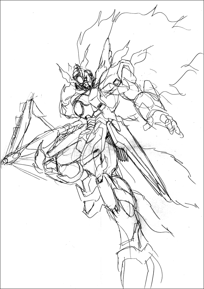 これは、最初期に、直感で、「全身から炎状の光の翼が漏れ出る」というギミックを図示したものですな。「海賊のパワーUP…と言ったら、幽霊船長かなあ?」という発想のもと、サブタイトルを「ゴースト」にしたわけですが、「クロスボーンガンダムが骨をしょっている以上、新登場のゴーストガンダム(になる可能性も、初期にはあった。)は幽霊しょってなきゃいけないなあ」と、いうことになり、「幽霊しょってるって…なに?!」的な、あたりから、不安定なゆらゆらを背負わせることにしたしだい。いずれ詳しいデザイン経由はどこぞでご紹介できるものと思います。