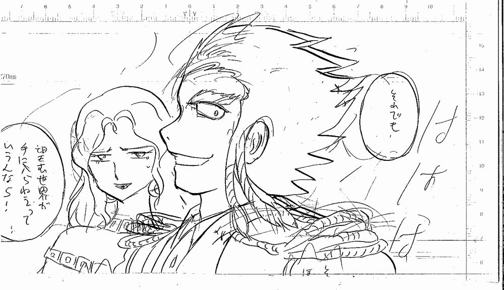 さて今回のスケッチはその32話からのボツ原稿です。上は脱出してきたトレスにフォントが抱きつくシーンの前。このコマの前はトレスはカーティスと話していたので、ここでフォントを入れないとトレスが誰に話しかけてるかわかりにくいので差し替え。下のキゾは、実際に使われたコマと比べてみるとかなり淡白な印象。これではキゾのもてあますほどのどす黒さが出ない!と判断されたのでしょう。