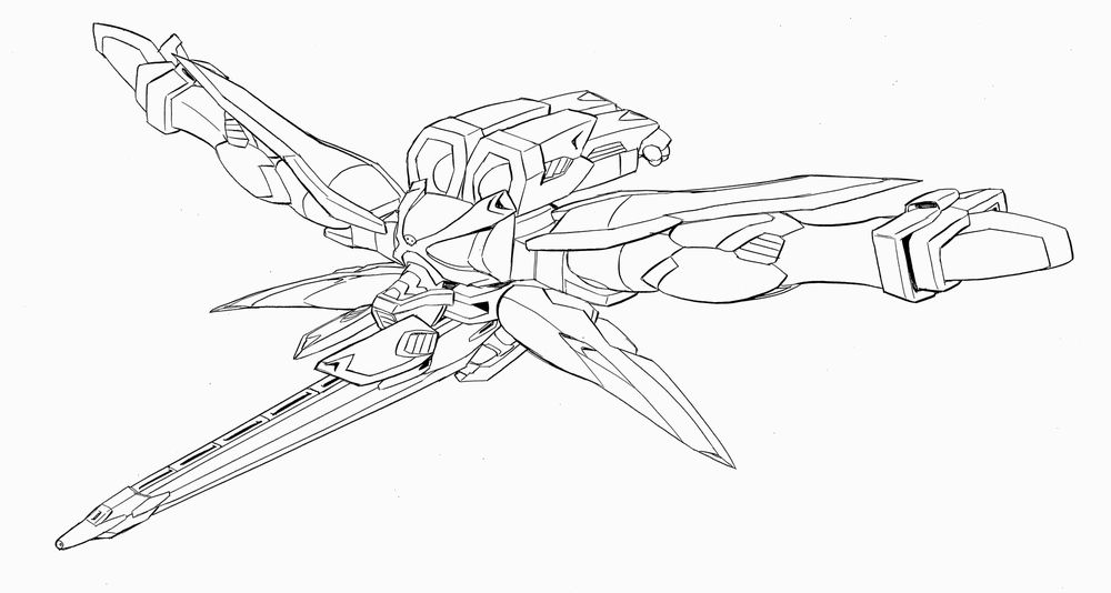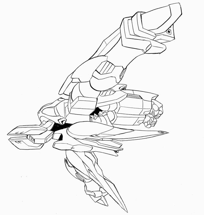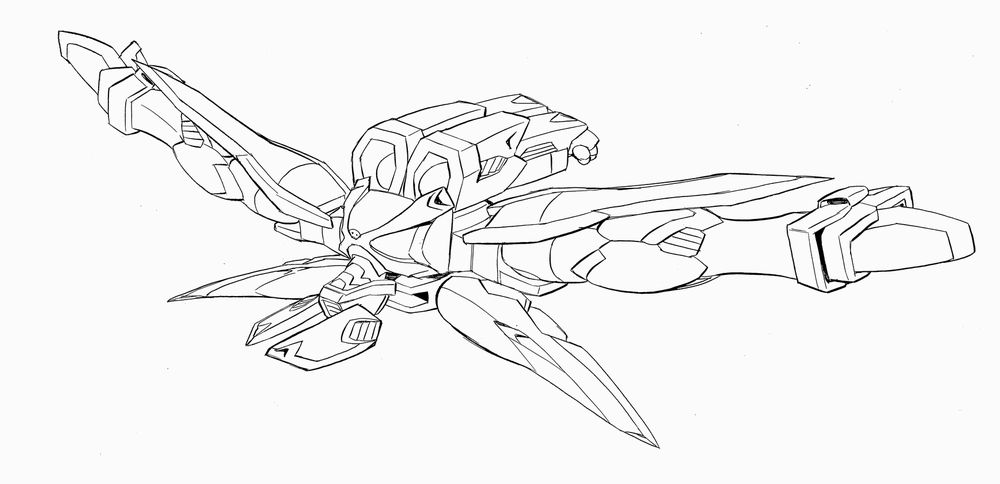 え?ポリゴン、と思った方もおられるでしょうが、いやぁ〜時代が変わりましたなあ。こうして変形メカの立体を確認できるんだものなあ。あ〜、いやいや、自分でやったんじゃなくて、宮崎真一君が、私の原案をこうしてポリゴンで検証してくれたんですけれどもね。そして、これを下敷きに私が起こしたのが以下の線画になります!