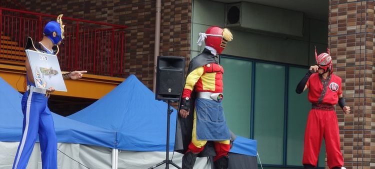 神奈川のミヤマ☆仮面のステージに宮城のBBQ烈怒が参戦! ミヤマ☆仮面の体操はかなりウケてました。子どもの好きな動きをよく研究してる!