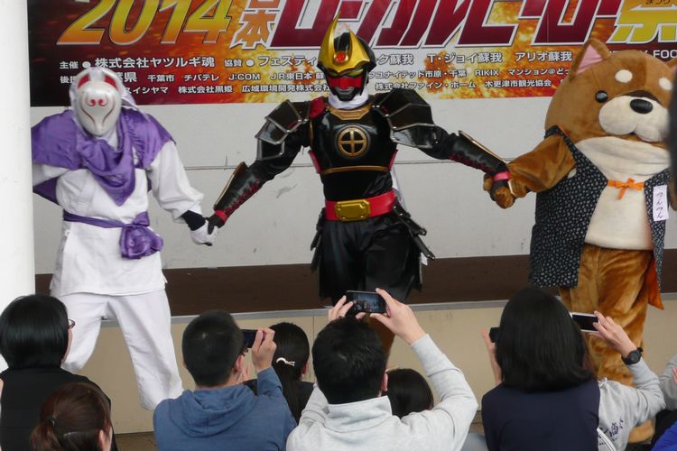 薩摩剣士隼人。ゆるキャラが小さい子をひきつけ、それを見守るおおらかな隼人がいる。グリーティングタイムには敵方のヤッセンボーとくぐり狐衆にもちびっこが集まってまして、キャラづくりが絶妙だーと思いました。