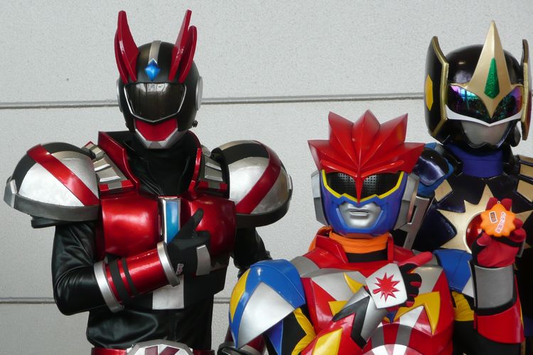 左が福岡のキタキュウマン、中央は広島の安芸戦士メープルカイザー。デザインは「楓」じゃなく、あくまで「もみじまんじゅう」なのね(笑)。右端が京都から来た太陽光戦士サンライガー