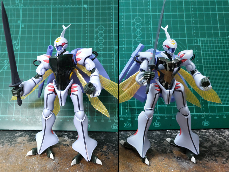 設定上は、ダンバインの装甲は「マジックミラー的な物」なのでハーフミラーメッキで正解だと思うのですが、古いプラモマニア的には、こっちのほうが落ち着くな、って(笑)