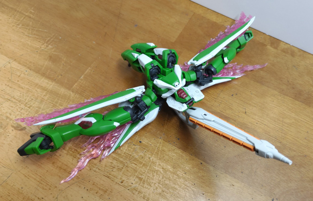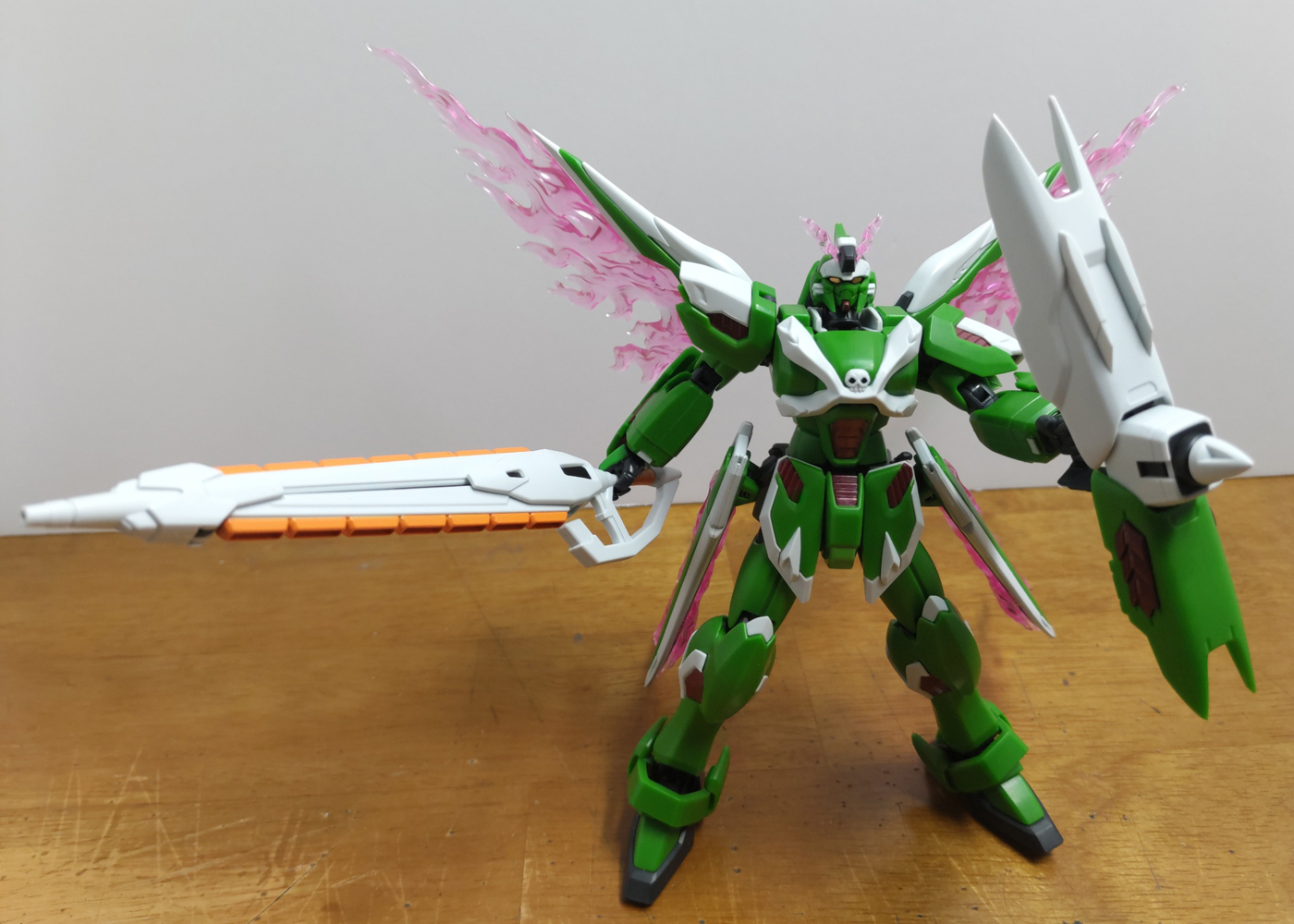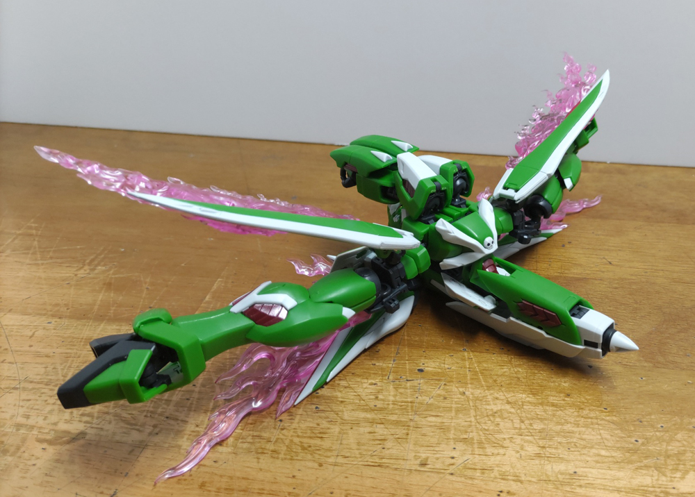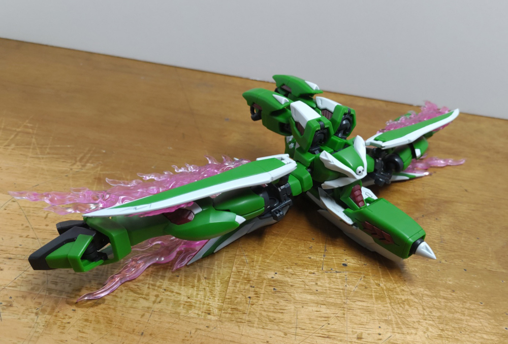 ところで、この変形、(前のファントムガンダム、あるいはゴーストガンダムをお持ちの方もおわかりでしょうが)1~2個パーツの付け替えはあるものの、ほとんどストレスなく、スイスイとできてしまいます。どうしても変形が複雑になることの多い現代のメカシーンにおいて、主題歌を口ずさんでる間に変形が終わってしまう、(主題歌ないけど 笑)変形メカの醍醐味を味わえる素晴らしい設計だと、私は思うのですが、皆様どうでしょうか?