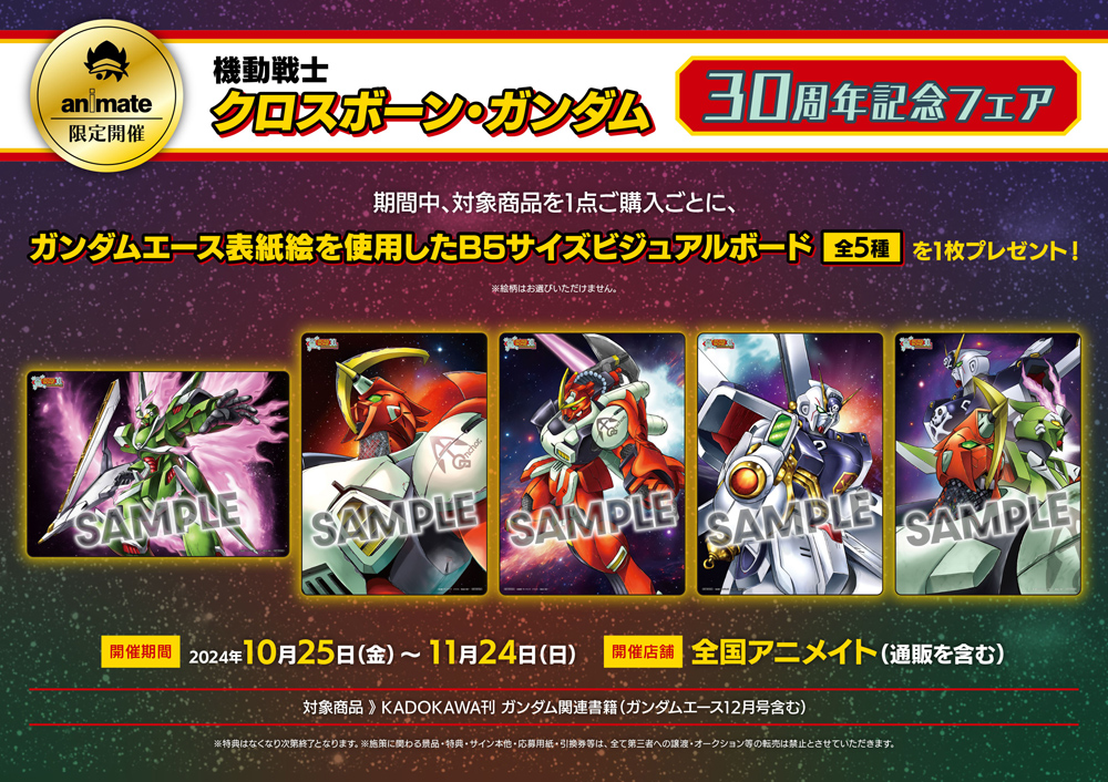アニメイトさんが「機動戦士クロスボーン・ガンダム 30周年」記念フェアをやってくださる!とのことで、いや、ありがとうございます~!ご覧の5点のB5ビジュアルボードを1枚、プレゼント!ということで、