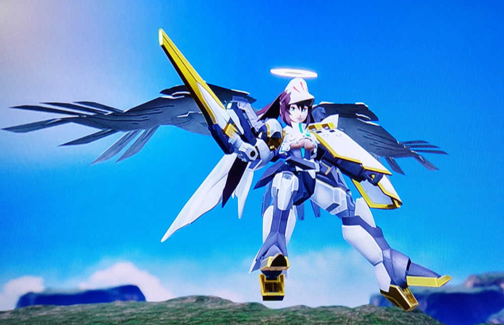 頭の上の輪もモノローダーに使ったのと同じものを使おうとしたのだけど、(え~と、思い出した!ヴォワチュール・リュミエールだ!)どうやっても大きくなりすぎるので、ダリルバルデの角を2つ、組み合わせて作りました。胸当てはジークアクスのアンテナですね。