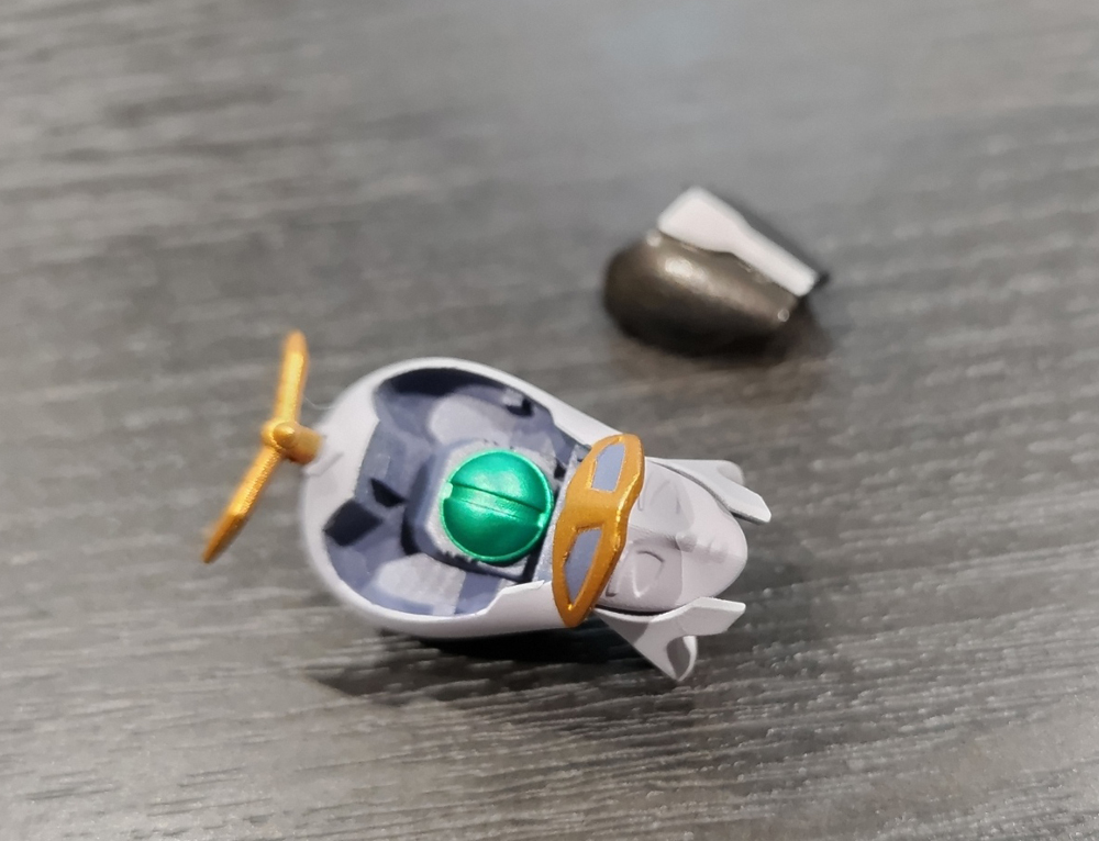 設定をご存じの方はわかるでありましょうが、実はアンヘル・ディオナの「頭部」とはこの、帽子の部分であり(こちらも内側まで作りこんでアルゥ!)顔に見えるところはコマーシャルフォースとしてのただの飾り、なんですね。なのでスタッフの方が帽子部分の方をほかの機体の頭部サイズに合わせてデフォルメしたと思われ、最初は飾り顔が大分小っちゃかったんですよ。